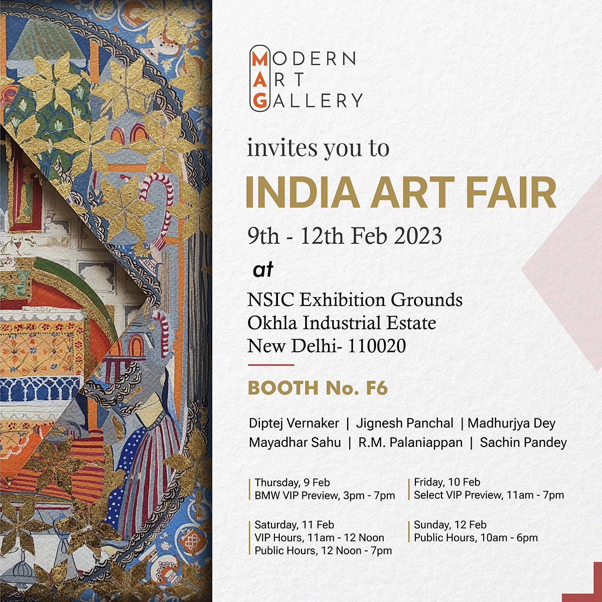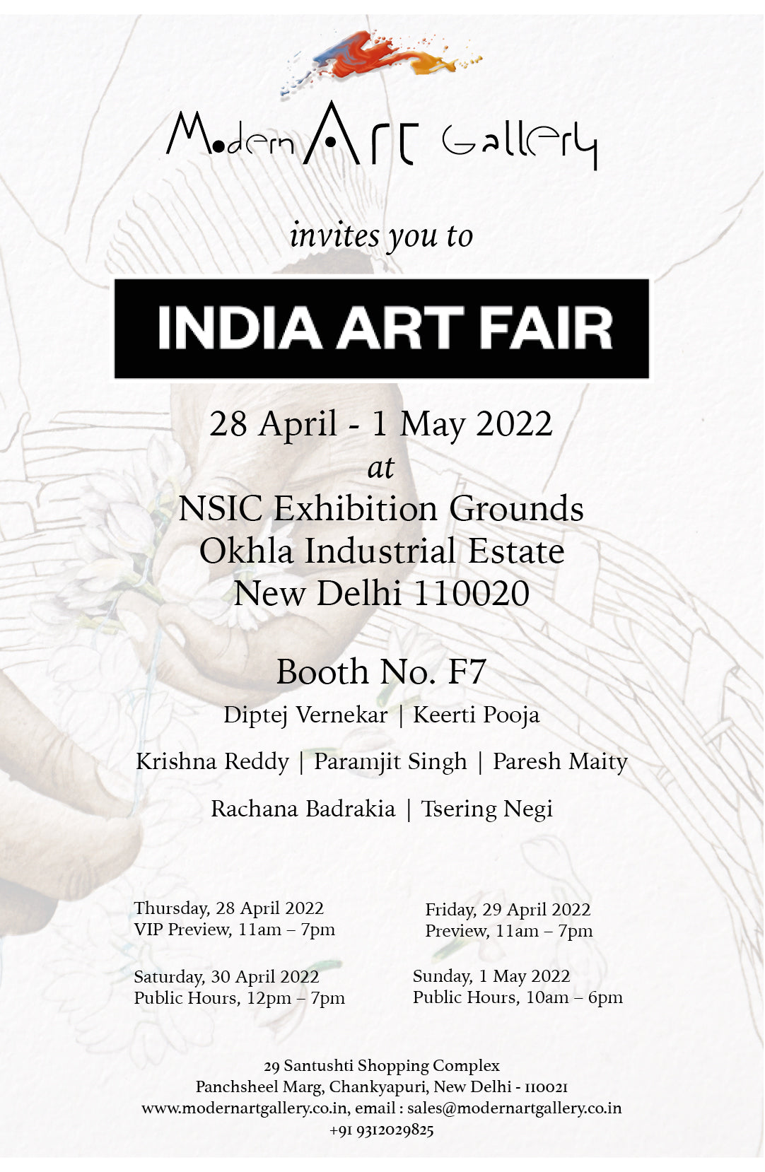 ![]() Name : ART MUMBAI Date : 14th November - 17th November 2024 Venue : Booth 69, Mahalaxmi Racecourse, Mumbai Download Dossier | ![]() Name : OUT OF TURN Date : 15th August - 22nd August 2024 | 11am-7 pm Venue : FF CCA Building, Bikaner House, India Gate, New Delhi Download Dossier | ![]() Name : TAPESTRY OF TIME Date : 10th July - 16th August 2024 Venue : 29, Santusthi Shopping Complex, Chanakyapuri, New Delhi - Delhi - 110003. Download Dossier | |