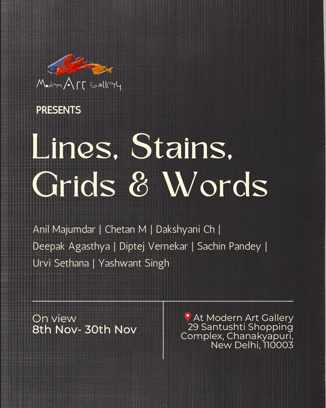 ![]() Name : WHISPERS OF PARADOX Date : 28th Jan - 28th Feb 2024 Venue : 29, Santushti Shopping Complex, Chanakyapuri, New Delhi, Delhi 110003 Download Dossier | ![]() Name : LINES STAINS GRIDS & WORDS Date : 1st Dec 2023 - 10th Jan 2024 Venue : 29, Santushti Shopping Complex, Chanakyapuri, New Delhi, Delhi 110003 Download Dossier |