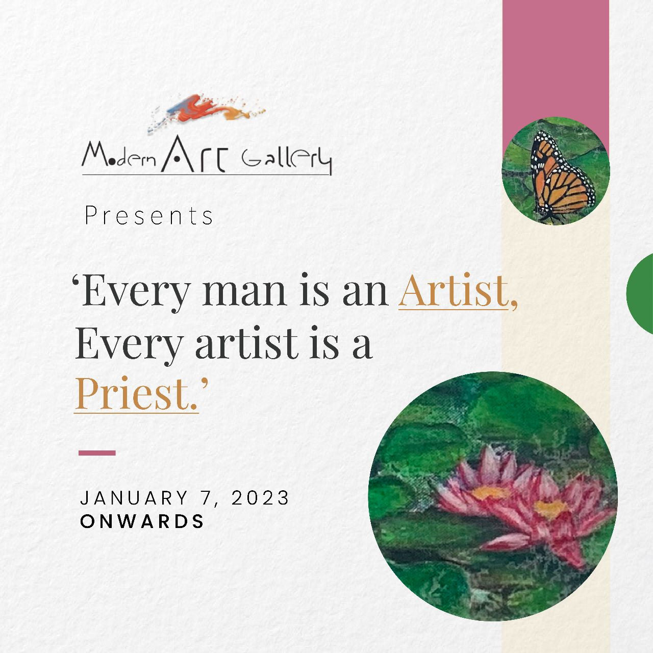 ![]() Name : INDIAN ART FAIR Date : 9th - 12th Feb 2023 Venue : NSIC Exhibition Grounds Okhla Industrial Estate, New Delhi - 110020 Download Dossier | ![]() Name : EVERY MAN IS AN ARTIST,EVERY ARTIST IS A PRIEST. Date : 7th Jan 2023, Onwards Venue : 29, Santushti Shopping Complex, Chanakyapuri, New Delhi - 110021 Download Dossier |